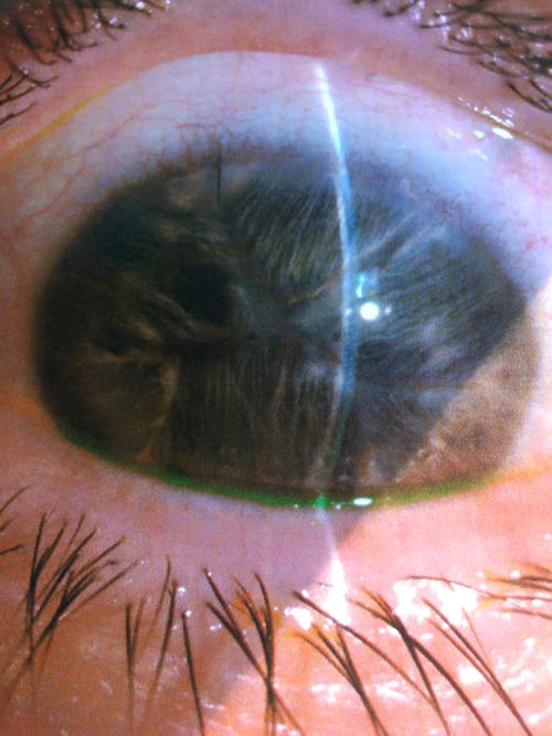 Изображение любезно предоставлено доктором Эдвардом Бошиком. Это фотография глаза, перенесшего операцию LASIK, у которого через несколько лет после операции развились осложнения, включая множественные инфекции, что привело к полной слепоте. Пациент перенес 5 неудачных операций по пересадке роговицы и в настоящее время ожидает шестую операцию по пересадке роговицы.