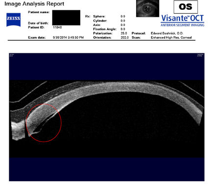 На рисунке ниже представлен снимок глаза пациента, перенесшего операцию по удалению RK в 1980-х годах, за которой последовала операция LASIK в 2003 году. В 2014 году пациентка внезапно потеряла зрение на левом глазу из-за эктазии роговицы. Внутриглазное давление, оказываемое на истонченную, ослабленную стенку роговицы, привело к разрыву внутренней оболочки роговицы (десцеметовой мембраны). На этом изображении, сделанном с помощью оптической когерентной томографии (ОКТ), вы можете видеть разрыв мембраны, обведенный красным кружком. Когда произошел разрыв, жидкость из глаза попала в роговицу, в результате чего роговица затуманилась, а зрение в этом глазу стало очень нечетким. Это состояние известно как "водянка". Вы заметите, что над роговицей находится склеральная линза, представленная двумя тонкими полупараллельными линзами. Назначение склеральной линзы - обеспечить зрение и защитить поврежденную ткань роговицы.