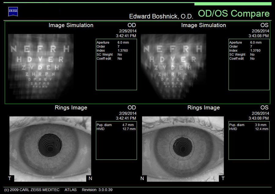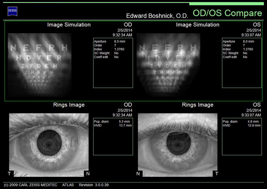 На рисунке ниже показаны визуальные искажения пациента, который первоначально перенес Хирургия РК при миопии на 10 диоптрий. После неудачной первой операции пациенту была проведена дополнительная операция RK, за которой последовали 2 операции LASIK на каждом глазу. "Имитация изображения" (верхняя часть изображения) иллюстрирует, как пациент видит глазную диаграмму. На рисунке "Кольца" (нижняя часть) показано, как лучи света отклоняются от идеально круглых концентрических колец, которые вы могли бы видеть обычным глазом. Щелкните изображение, чтобы увеличить.