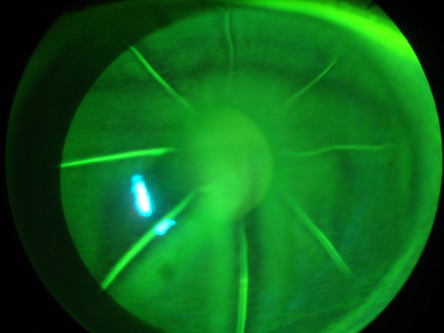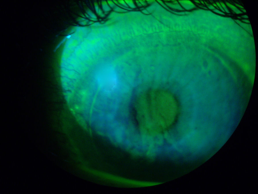На фотографии ниже представлен глаз пациента, перенесшего операцию LASIK в 2003 году. Край лоскута LASIK все еще виден на этой фотографии 2012 года, демонстрирующей неспособность лоскута к заживлению У пациента есть болезнь сухого глаза , которые проявляются в виде сухих пятен на роговице. (Для освещения поврежденных тканей после закапывания зеленого красителя в глаз используется специальный свет). Небольшие, плохо очерченные овальные или круглые участки чуть ниже лоскута LASIK между 11:00 и 1:00 - это врастание эпителия У пациента также есть эктазия после операции LASIK Нажмите на фотографию, чтобы увеличить ее.