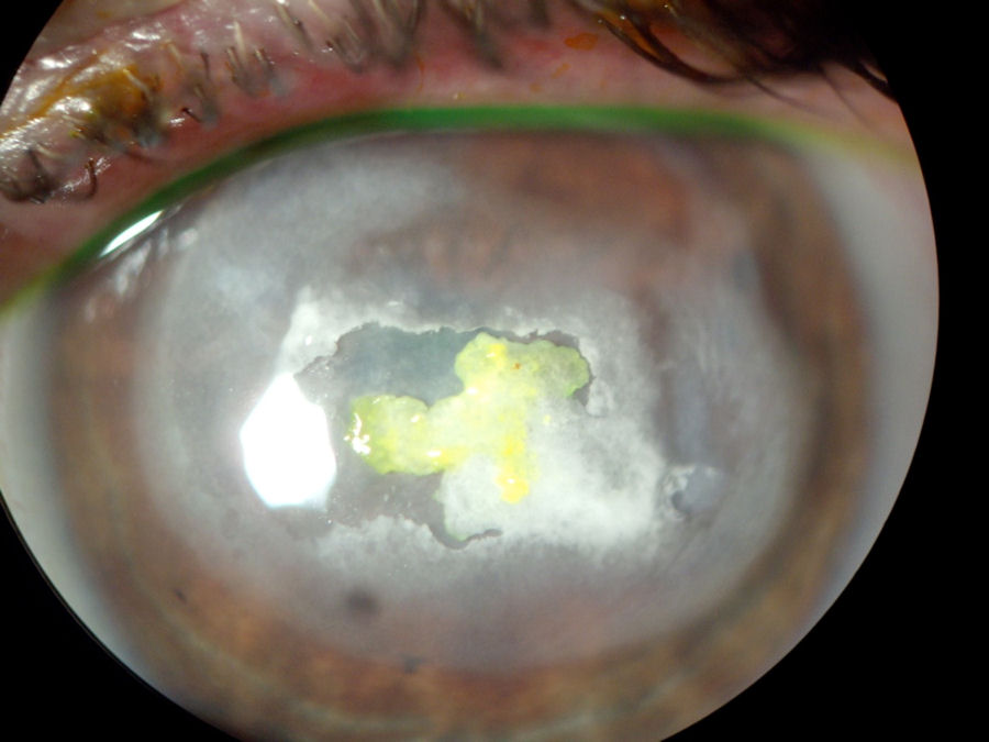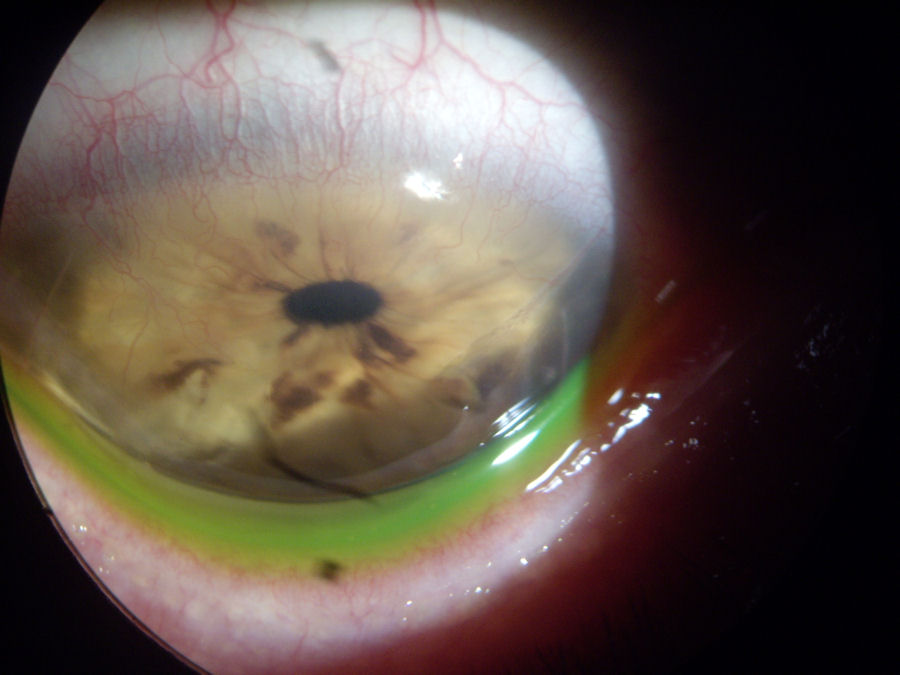 На фотографии ниже представлена роговица после операции LASIK с врастание эпителия , эктазия , и ПОТРЕБЛЯЕМЫЕ ВЕЩЕСТВА .