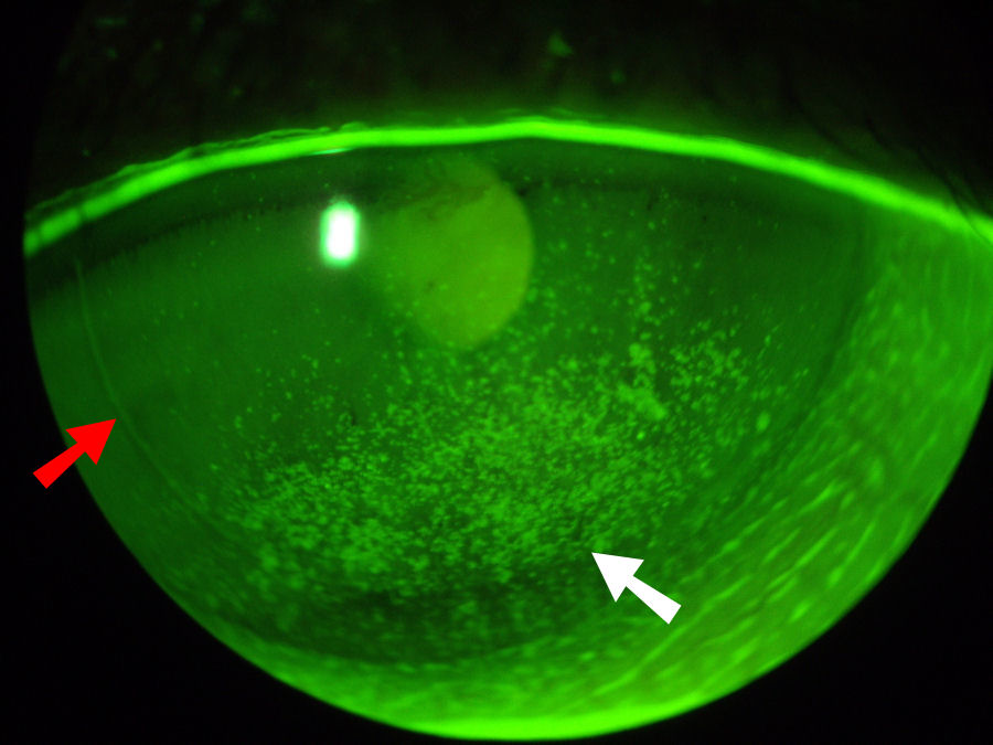 На фотографии ниже показаны серьезные сухие глаза у пациента, перенесшего операцию LASIK с последующим ФРК . Красная стрелка указывает на край лоскута LASIK. В глаз был закапан зеленый краситель, который выделяет участки поражения поверхности и потерю поверхностных клеток (эпителия). Белая стрелка на этой фотографии указывает на большой сухой область роговицы, которая выглядит как скопление пятен. Нажмите на фотографию, чтобы увеличить.