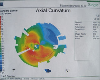 На рисунке ниже показано сильно искаженное зрение пациента, перенесшего операцию LASIK в 2001 году. Два года спустя у него развился эктазия роговицы и был оставлен своим хирургом. Без специальных жестких контактных линз этот пациент не может функционировать. Нажмите на изображение, чтобы увеличить.