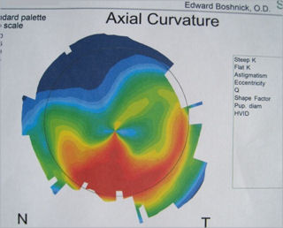 На трех изображениях ниже показан глаз спустя 22 года после лучевая кератотомия (РК) хирургия. Хорошо известно, что роговица не способна к полному заживлению - вместо этого в ответ на повреждение образуется рубцовая ткань, которая видна на этих фотографиях. Хирург сделал надрезы такой длины, что они выходят за пределы поля зрения пациента, создавая размытость и визуальные искажения. Зрение пациента невозможно скорректировать даже с помощью специальных жестких линз. Второе изображение в серии - это фотография, сделанная после того, как в глаз был закапан зеленый краситель. Краситель попал во все еще открытые незажившие разрезы на коже. Третье изображение представляет собой топографию роговицы, на которой видна крайне неправильная форма поверхности роговицы (индуцированный неправильный астигматизм). Нажмите на изображение, чтобы увеличить.