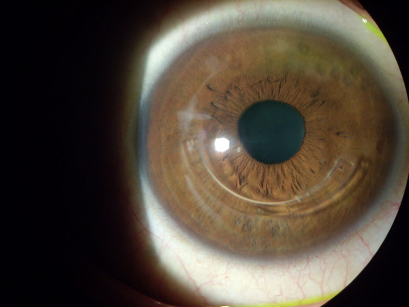 Глаз, изображенный на фотографии ниже, был подвергнут кондуктивной кератопластике (КК) в попытке исправить зрение пациента после сверхкоррекции LASIK. До этих операций у пациента было отличное зрение в очках. Сейчас у пациента крайне нечеткое и искаженное зрение, которое невозможно исправить с помощью очков. Нажмите на фотографию, чтобы увеличить.