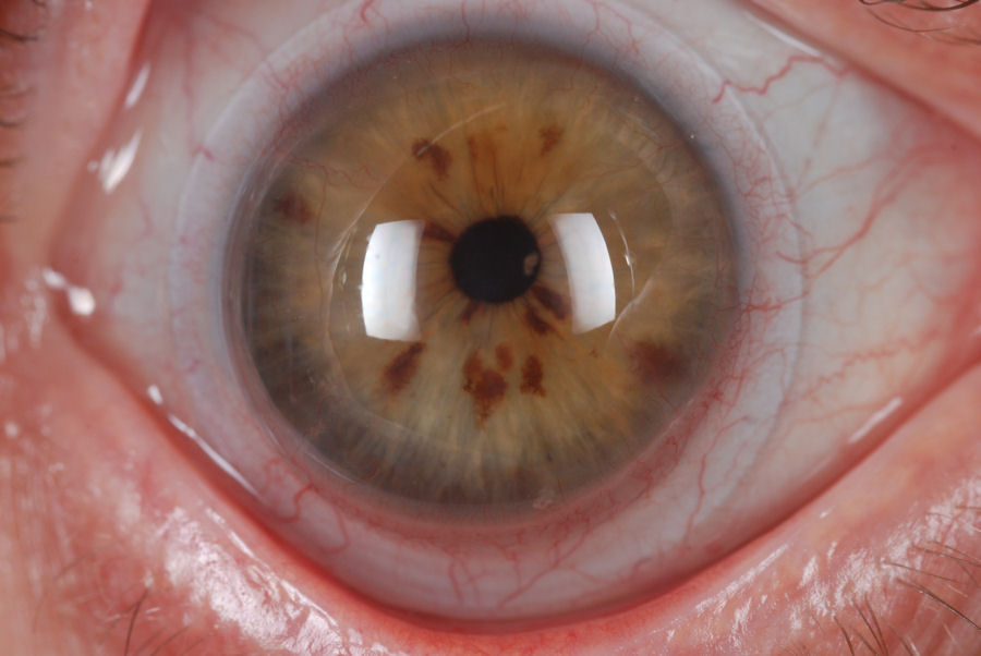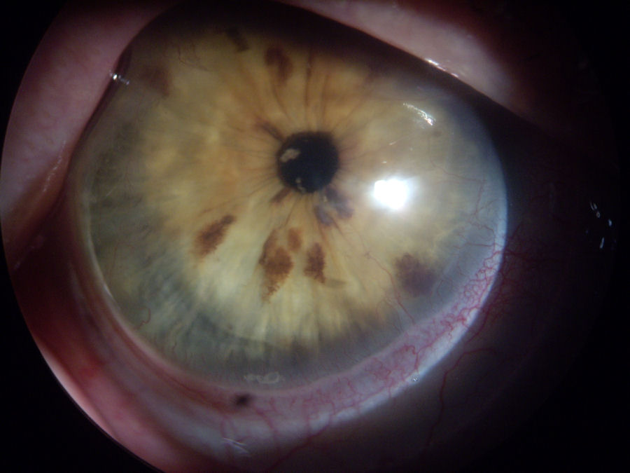 На двух изображениях ниже изображен один и тот же глаз при разном освещении. У пациента был Хирургия РК в 1990 году. У него ухудшилось зрение, и в 2001 году ему было рекомендовано пройти операцию LASIK. В течение года после операции у пациента развился эктазия роговицы Обратите внимание, что после стольких лет разрезы на коже все еще открыты и, вероятно, останутся открытыми до конца его жизни.