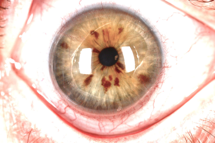 На фотографии ниже показан глаз пациента, у которого был РК (радиальная кератотомия) в 1988 году, а пятнадцать лет спустя, в 2003 году, была проведена операция LASIK. Белая стрелка указывает на один из незаживших разрезов RK (радиальные линии). Красная стрелка указывает на незаживший край лоскута LASIK. Зрение пациента сильно искажено. Нажмите на фотографию, чтобы увеличить.