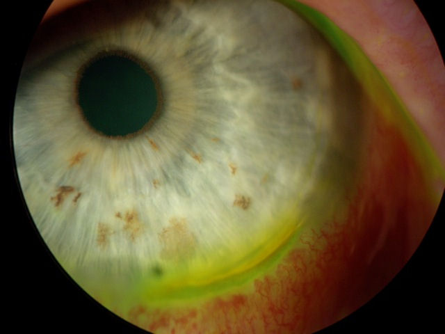 Приведенные ниже фотографии были сделаны с помощью щелевой лампы (биом-микроскопа) после инстилляции флуоресцеиновый краситель . Синий свет используется для подсветки красителя, который окрашивает поврежденные участки роговицы. Желто-зеленый круг по периферии роговицы - это край лоскута LASIK. Он окрашивается, потому что граница раздела все еще открыта, что свидетельствует о неспособности роговицы к полному заживлению.