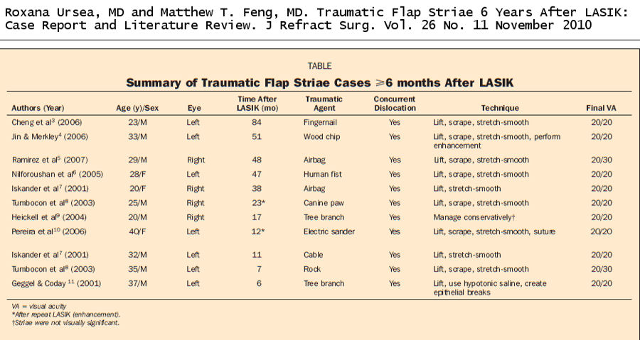 "Было показано, что отсроченная травма приводит к дефектам лоскутов, демонстрируя, что лоскуты LASIK остаются уязвимыми к травматическому расхождению и смещению даже через 6 или 7 лет после операции".; Источник: Роксана Урси, доктор медицинских наук, и Мэтью Т. Фенг, доктор медицинских наук. Травматические стрии с помощью лоскута через 6 лет после операции LASIK: Отчет о случае и обзор литературы. Рефракционная хирургия, Том 26, № 11, ноябрь 2010