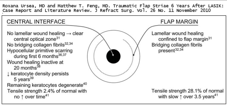 "Кроме того, если прозрачность интерфейса [LASIK] указывает на отсутствие заживления раны, можно ожидать, что интерфейс остается потенциальным пространством и адгезия лоскута нарушается в течение всего срока службы лоскута ."(Урсея и Фенг, 2009)