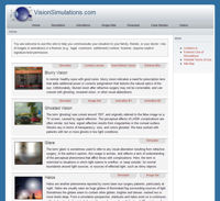 VisionSimulations.com :: На этом сайте, созданном автором и психологом Роджером Д. Дэвисом, доктором философии, представлены фотореалистичные изображения зрительных аберраций, вызванных LASIK и другими рефракционными операциями, включая звездообразование, ореолы, блики, призрачность, нечеткое зрение и сцены ночного вождения. Также содержит множество анимаций и симуляторов, которые позволяют пациентам приблизить свое видение к друзьям, родственникам и врачам и сообщать о нем. Если вам нужна помощь в моделировании вашего видения для других, начните здесь.