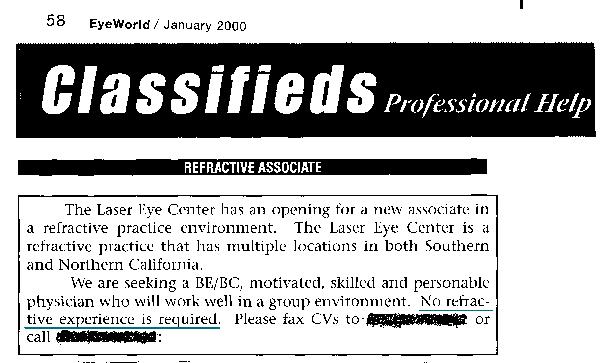К сожалению, закон не требует, чтобы врачи, проводящие LASIK, имели какой-либо опыт работы под наблюдением или даже были офтальмологами. Ознакомьтесь с приведенным ниже объявлением о приеме на работу. Некоторые хирурги начинают проводить LASIK после всего лишь курса выходного дня.