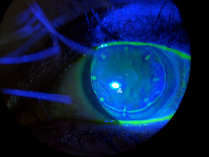 На рисунке ниже показан глаз после операции LASIK с неоваскуляризацией, на который надета склеральная линза. Рост кровеносных сосудов на роговице в положении 6:00 очень выражен.